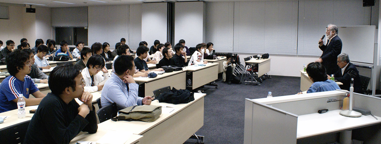 そして、講座に呼ばれるゲストの側にとっても、あれはとても珍しい場だったのだと思います。あの頃はサイフォンはまだなかったので、私個人がという話になりますが、当時から青二プロダクション附属俳優養成所の青二塾さんと親しくしていたこともあって、一度、青二の創業者の方々を「コンテンツ文化史」にお招きしたことがあります。ひょんなことで吉田先生に「声優さんのお話聞きたいですか?」とお話したところ、「いいね、聞くべきだよね!」とすぐに段取りを組んでくださったのでした。東大にきてくれたのは、当時青二の相談役だった黒田さんと、青二塾の塾長を務められている北川さんでした。業界の上も下も分かっていない私はとても気軽にお呼びしたのですが、声優という職業を必死に確立してこられた青二のお2人にとってはそうではありませんでした。口々に「東大に呼ばれて講演する日がくるなんて」としきりにおっしゃられていたのを覚えています。そのとき撮影した写真は、青二塾の入塾案内に記念に掲載されています。弔辞をお聞きして気づいたのですが、コミケの準備委員会の方々、横えびさん、その他あのプログラムをきっかけに知り合い、その後の展開が始まった方々というのは数多くいらっしゃったことでしょう。あの授業が、そうした結節点になった例は他にもたくさんあると思います。