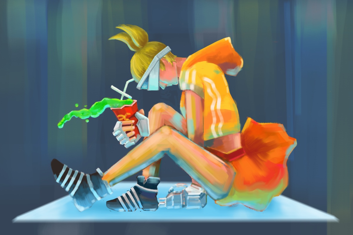 厚塗りで下の色が潰れたといえども、やはりアナログだと混色のCMYKの表現になってしまいます。絵の具にも蛍光色のものはありますが、やはり限界があります。(透明度が高くなってしまったり、変に浮いて馴染まなかったり)