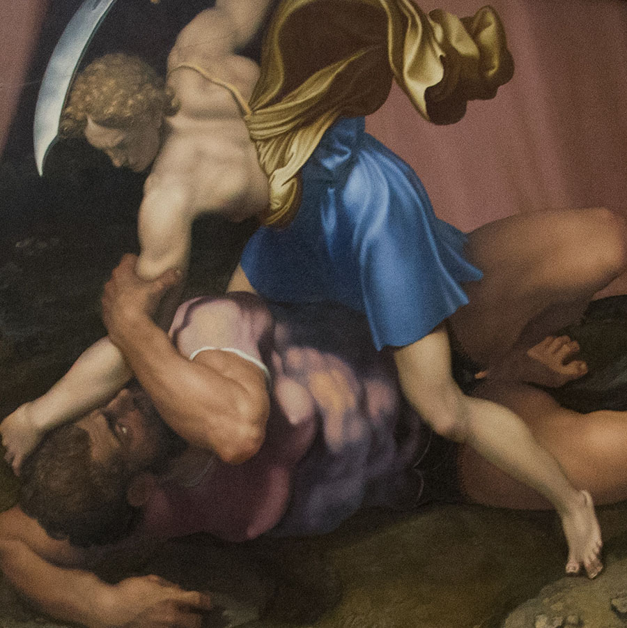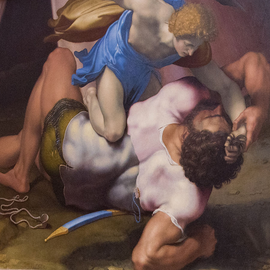 ダニエレ・ダ・ヴォルテッラ作「ダビデとゴリアテ」。絵の中では、今まさにダビデがゴリアテの首を撥ねようとしています。明るく、マニエリスム様式特有の技巧的で豊かな肉体美。ですが、この作品で驚かされるのはここからです。絵の周りをぐるりと回り込むと、今度は反対側から、ダビデとゴリアテの格闘を覗き込むことができるのです。それこそが、この作品がギャラリーの中央に設置されている理由。表と裏、両面に描かれた作品なのです。