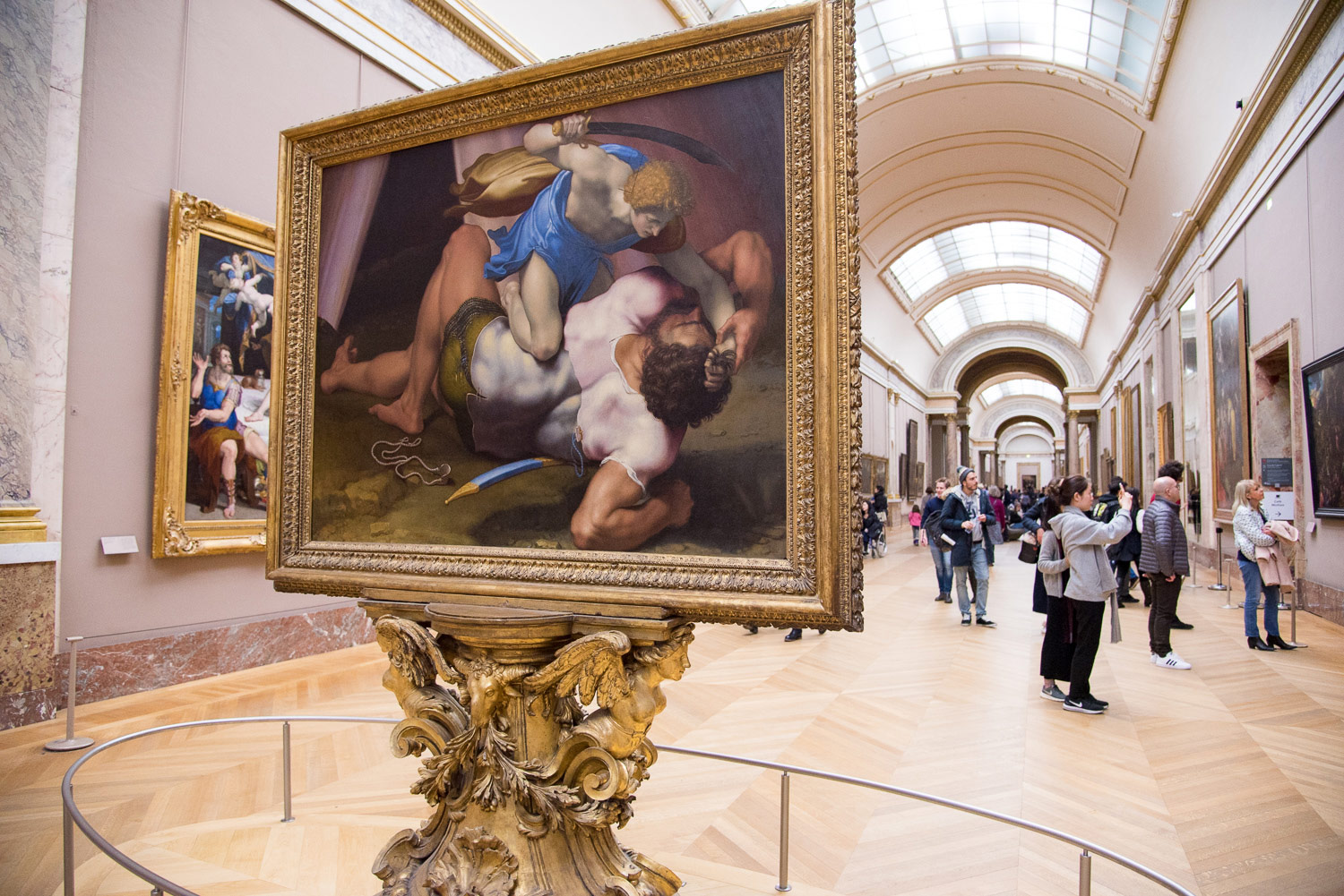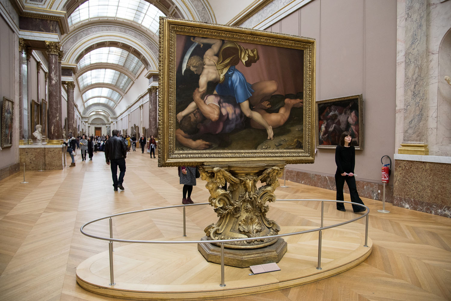 フランス、パリ。ルーブル美術館ドゥノン翼のイタリア・グランド・ギャラリーを歩いていると、少し変わった絵画に出会います。絵画といえば壁に飾ってあるもの、という私たちの先入観を覆し、その作品はギャラリーの中央に設置されています。
